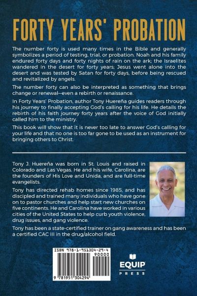 Putting God's Plan for Your Life into Action For many Christians, we hear the call to action and know what we should be doing to further God's Kingdom-the problem is that we don't follow through for a myriad of different reasons. It could be we think we aren't ready yet or that we are ill-equipped for such a task. It could be that we feel our past is too sinful and will render us ineffective. As a result, we run away from God. We try to escape or bypass His plans for our life and do it our own way instead. But as we learned from the story of Jonah, you cannot outrun God-no matter how hard you try. Forty Years' Probation author Tony Huereña can attest to this better than anyone. In this book, he details his journey back to Christ forty years later and teaches the reader how to follow through and put into action God's plan for their own life.