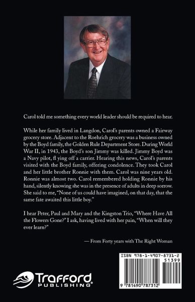 Carol told me something every world leader should be required to hear. While her family lived in Langdon, Carols parents owned a Fairway grocery store. Adjacent to the Roehrich grocery was a business owned by the Boyd family, the Golden Rule Department Store. During World War II, in 1943, the Boyds son Jimmy was killed. Jimmy Boyd was a Navy pilot, fl ying off a carrier. Hearing this news, Carols parents visited with the Boyd family, offering condolence. They took Carol and her little brother Ronnie with them. Carol was nine years old. Ronnie was almost two. Carol remembered holding Ronnie by his hand, silently knowing she was in the presence of adults in deep sorrow. She said to me, None of us could have imagined, on that day, that the same fate awaited this little boy. I hear Peter, Paul and Mary and the Kingston Trio, Where Have All the Flowers Gone? I ask, having lived with her pain, When will they ever learn? From Forty years with The Right Woman