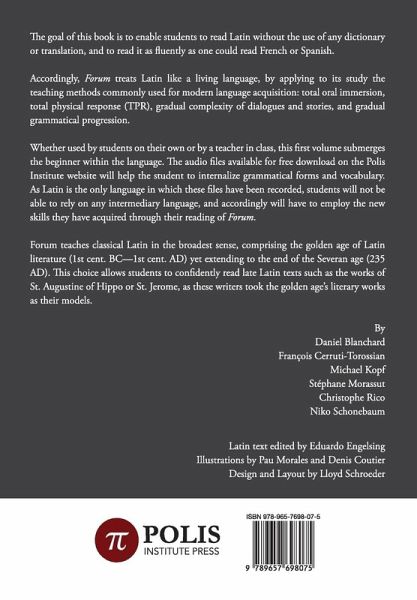 The goal of Forum is to enable students to speak Latin as a living language. Studies have shown that unless one speaks, reading fluency becomes difficult to attain. Because it teaches students to speak Latin, Forum prepares them to read without the use of dictionary or translation, and to read as fluently as one might read in any modern language. Forum applies to Latin the teaching methods commonly used for modern language acquisition: total oral immersion, total physical response (TPR), role-playing games, gradual complexity of dialogues and stories, and gradual grammatical progression. Whether used by students on their own or by an instructor with a group, this first-level book submerges the student within the language. The audio files that are available for free download on the Polis Institute website will help the student to internalize grammatical forms and vocabulary. As only the Latin language is heard by the students using these files, they are unable to rely on an intermediary language and are thus compelled to employ the new skills they have acquired through this text. Forum teaches Classical Latin in the broadest sense. The classical period includes the golden age of Latin literature (1st c. BC – 1st c. AD) as well as the Imperial Latin from the Nerva-Antonine dynasty (96-192 AD) and the Severan dynasty (193-235 AD). This period has the advantage of being an intermediate between pre-Classical Latin and Late Latin (3rd c.-6th c. AD). Even authors from the 4th or 5th centuries AD such as St. Augustine of Hippo or St. Jerome, albeit writing in a slightly different language than the classical one, took the golden age of Latin literature as a reference. Studying Classical Latin (in the broad sense) allows us to easily read the most interesting Latin texts of Antiquity and the Middle Ages.