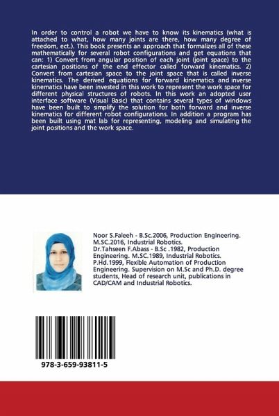 In order to control a robot we have to know its kinematics (what is attached to what, how many joints are there, how many degree of freedom, ect.). This book presents an approach that formalizes all of these mathematically for several robot configurations and get equations that can: 1) Convert from angular position of each joint (joint space) to the cartesian positions of the end effector called forward kinematics. 2) Convert from cartesian space to the joint space that is called inverse kinematics. The derived equations for forward kinematics and inverse kinematics have been invested in this work to represent the work space for different physical structures of robots. In this work an adopted user interface software (Visual Basic) that contains several types of windows have been built to simplify the solution for both forward and inverse kinematics for different robot configurations. In addition a program has been built using mat lab for representing, modeling and simulating the joint positions and the work space.