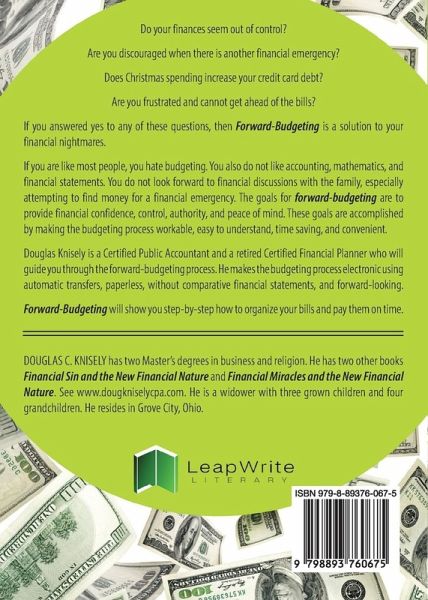 Do your finances seem out of control? Are you discouraged when there is another financial emergency? Does Christmas spending increase your credit card debt? Are you frustrated and cannot get ahead of the bills? If you answered yes to any of these questions, then Forward-Budgeting is a solution to your financial nightmares. If you are like most people, you hate budgeting. You also do not like accounting, mathematics, and financial statements. You do not look forward to financial discussions with the family, especially attempting to find money for a financial emergency. The goals for forward-budgeting are to provide financial confidence, control, authority, and peace of mind. These goals are accomplished by making the budgeting process workable, easy to understand, time saving, and convenient. Douglas Knisely is a Certified Public Accountant and a retired Certified Financial Planner who will guide you through the forward-budgeting process. He makes the budgeting process electronic using automatic transfers, paperless, without comparative financial statements, and forward-looking. Forward-Budgeting will show you step-by-step how to organize your bills and pay them on time.