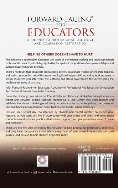 The evidence is undeniable: Educators are some of the hardest-working and underappreciated professionals on earth, a truth highlighted by the epidemic proportions of compassion fatigue and burnout occurring across the field. There's no doubt that educators are purpose-driven, passionate helpers of children, families, and their communities, but with a never-ending list of responsibilities and reductions in many school resources year after year, the suffering and stress involved are fast outweighing the resilience reserves of so many. With Forward-Facing® for Educators: A Journey to Professional Resilience and Compassion Restoration, it doesn't have to be that way. Co-written by long-time educators Cheryl Fuller and Rebecca Leimkuehler alongside trauma expert and Forward-Facing® Institute founder Dr. J. Eric Gentry, this book teaches and validates the distinct challenges of being an educator today, while putting the power of personal healing and restoration firmly back in your hands-where it belongs. Envision each school day characterized by physical and mental comfort no matter what happens, as you work and live in accordance with your values and goals, and enjoy social connections and self-care practices that nourish, support, and give you a deep sense of peace and fulfillment. These are the five skills offered by the Forward-Facing® process for professional resilience, and they have the potency to transform every facet of your career in education, personal journey, and mission to help children beginning today.