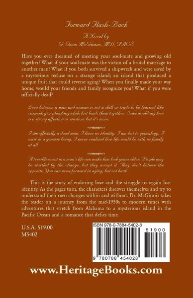 Have you ever dreamed of meeting your soul-mate and growing old together? What if your soul-mate was the victim of a brutal marriage to another man? What if you both survived a shipwreck and were saved by a mysterious recluse on a strange island; an island that produced a unique fruit that could reverse aging? When you finally made your way home, would your friends and family recognize you? What if you were officially dead? Love between a man and woman is not a skill or trade to be learned like carpentry or plumbing while lust binds them together. Some would say love is a strong affection or emotion, but it's more. I am officially a dead man. I have no identity. I am lost to genealogy. I exist as a generic being. I never realized how life would be with no family at all. A terrible event in a man's life can make him look years older. People may be startled by the change, but they accept it. They don't believe the opposite. You can move forward in aging, but not back. This is the story of enduring love and the struggle to regain lost identity. As the pages turn, the characters discover themselves and try to understand their own changes within and without. Dr. McGinnis takes the reader on a journey from the mid-1950s to modern times with adventures that stretch from Alabama to a mysterious island in the Pacific Ocean and a romance that defies time.