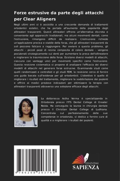 Negli ultimi anni si è assistito a una crescente domanda di trattamenti ortodontici estetici, che ha portato all'aumento della popolarità degli allineatori trasparenti. Questi allineatori offrono un'alternativa discreta e conveniente agli apparecchi tradizionali, ma alcuni movimenti dentali, come l'estrusione, rimangono difficili da realizzare. L'estrusione richiede un'applicazione precisa e stabile della forza, che gli allineatori trasparenti da soli possono faticare a raggiungere. Per ovviare a questo problema, gli attacchi - piccoli pezzi di resina composita di colore dentale - vengono posizionati strategicamente sui denti per aumentare la presa dell'allineatore e migliorare la trasmissione della forza. Esistono diversi modelli di attacchi, ciascuno con vantaggi unici per movimenti specifici come l'estrusione. Questa revisione sistematica si propone di analizzare l'efficacia dei diversi modelli di attacchi nel generare forze estrusive. Esaminando studi come quelli randomizzati e controllati e gli studi FEM, la revisione cerca di fornire una guida basata sull'evidenza per gli ortodontisti. L'obiettivo è quello di migliorare i risultati del trattamento, migliorare la soddisfazione dei pazienti e offrire ai medici preziose indicazioni per ottimizzare la terapia con allineatori trasparenti attraverso una selezione efficace degli attacchi.