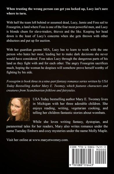 When trusting the wrong person can get you locked up, Lucy isn't sure where to turn. With half the team left behind or assumed dead, Lucy, Jamie and Foss sail to Fossegrim, a land where Foss is one of the four most powerful men, and Lucy is blonde chum for slave-traders, thieves and the like. Keeping her head down is the least of Lucy's concerns when she gets thrown with other abductees and put up for auction. With her guardian gnome MIA, Lucy has to learn to work with the one person who hates her most, leading her to make dark decisions she never would have considered. Foss takes Lucy through the dangerous parts of his land as they fight with and for each other. The angry Fossegrim sacrifices much, hoping the woman he despises will somehow prove herself worthy of fighting by his side. Fossegrim is book three in a nine-part fantasy romance series written by USA Today Bestselling Author Mary E. Twomey.