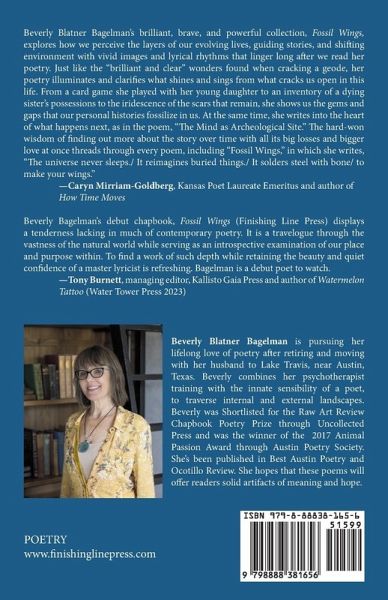 Fossil Wings surveys both inner and outer landscapes, exploring each with unabashed clarity of vision. Painful events such as a brother's addiction, the death of a sister, and the author's own health issues from toxic mold are acknowledged before arriving at acceptance and ultimate awareness of 'choice' in how we view and respond to loss. What stems from this is an ability to be in the moment, to view things clearly, and to act from a place of relative freedom, unshakled from mental constraints.