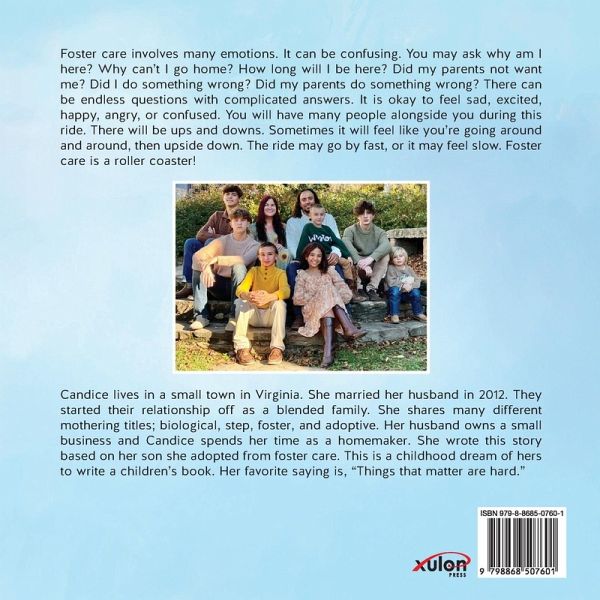 Foster care involves many emotions. It can be confusing. You may ask why am I here? Why can't I go home? How long will I be here? Did my parents not want me? Did I do something wrong? Did my parents do something wrong? There can be endless questions with complicated answers. It is okay to feel sad, excited, happy, angry, or confused. You will have many people alongside you during this ride. There will be ups and downs. Sometimes it will feel like you're going around and around, then upside down. The ride may go by fast, or it may feel slow. Foster care is a roller coaster! Candice lives in a small town in Virginia. She married her husband in 2012. They started their relationship off as a blended family. She shares many different mothering titles; biological, step, foster, and adoptive. Her husband owns a small business and Candice spends her time as a homemaker. She wrote this story based on her son she adopted from foster care. This is a childhood dream of hers to write a children's book. Her favorite saying is, "Things that matter are hard."
