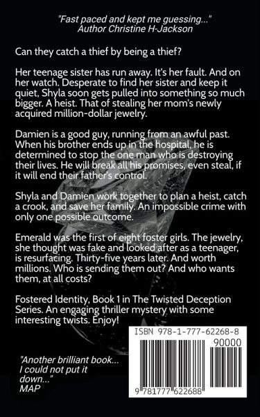 Can they catch a thief by being a thief? Her teenage sister has run away. It's her fault. And on her watch. Desperate to find her sister and keep it quiet, Shyla soon gets pulled into something so much bigger… a heist. That of stealing her mom's newly acquired million-dollar jewelry. Damien is a good guy running from an awful past. When his brother ends up in the hospital, he is determined to stop the one man who is destroying their lives. He will break all his promises, even steal, if it will end their father's control. Shyla and Damien work together to plan a heist, catch a crook, and save her family. An impossible crime with only one possible outcome. Emerald was the first of eight foster girls. The jewelry, she thought was fake and looked after as a teenager, are resurfacing. Thirty-five years later. And worth millions. Who is sending them out? And who wants them, at all costs? Fostered Identity is book 1 in The Twisted Deception Suspense Thriller Mystery Series. An engaging thriller mystery with some interesting twists. Enjoy! "Another brilliant book from this author... Once I started reading it, I couldn't stop." MAP "The story is complex and will keep you reading. I recommend it to anyone who loves a good mystery." S. Fetz "…fast-paced and kept me guessing." Author Christine Jackson "…the intrigue gets more and more intense and you just cannot put it down… Highly recommended." Steve Boncyk