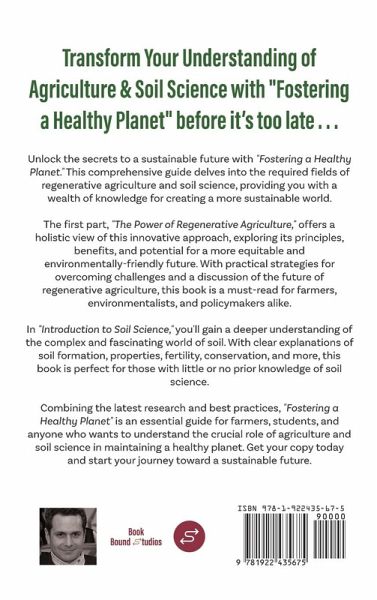 "Transform Your Understanding of Agriculture & Soil Science with "Fostering a Healthy Planet" Looking for an insightful and engaging guide to regenerative agriculture and soil science? "Fostering a Healthy Planet" is your 2-in-1 collection, providing essential knowledge for creating a sustainable future. From "The Power of Regenerative Agriculture:"It provides a holistic view of regenerative agriculture, covering this sustainable approach's principles, history, and benefits. It explores the environmental, economic, and social impacts of regenerative agriculture, highlighting the potential for this approach to create a more sustainable and equitable future. It addresses the challenges and barriers to implementing regenerative agriculture, offering practical solutions and strategies for overcoming these challenges. It discusses the future of regenerative agriculture, considering its role in shaping a more sustainable and resilient food system. It is written in an accessible and engaging style, making it a valuable resource for farmers, environmentalists, policymakers, and anyone interested in the future of food and farming. From "Introduction to Soil Science:"This book provides a detailed and easy-to-understand overview of the complex world of soil science. It covers a wide range of topics, including soil formation and classification, physical, chemical, and biological properties of soil, fertility and nutrient management, erosion and conservation, and soil management. This book is written in an accessible style, making it suitable for readers with little or no prior knowledge of soil science. Distinct from other resources, this 2-in-1 collection brings together the latest research and practices, making it an essential guide for farmers, students, and anyone seeking to understand the critical role agriculture and soil science play in maintaining a healthy planet. Take the first step towards a more sustainable future and get your copy of "Fostering a Healthy Planet" today!