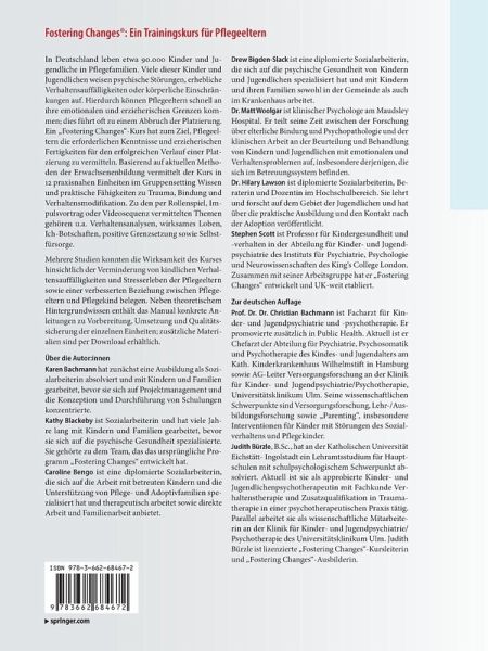 Karen Bachmann hat zunächst eine Ausbildung als Sozialarbeiterin absolviert und mit Kindern und Familien gearbeitet, bevor sie sich auf Projektmanagement und die Konzeption und Durchführung von Schulungen konzentrierte. Kathy Blackeby ist Sozialarbeiterin und hat viele Jahre lang mit Kindern und Familien gearbeitet, bevor sie sich auf die psychische Gesundheit spezialisierte. Sie gehörte zu dem Team, das das ursprüngliche Programm "Fostering Changes" entwickelt hat. Caroline Bengo ist eine diplomierte Sozialarbeiterin, die sich auf die Arbeit mit betreuten Kindern und die Unterstützung von Pflege- und Adoptivfamilien spezialisiert hat und therapeutisch arbeitet sowie direkte Arbeit und Familienarbeit anbietet. Drew Bigden-Slack ist eine diplomierte Sozialarbeiterin, die sich auf die psychische Gesundheit von Kindern und Jugendlichen spezialisiert hat und mit Kindern und ihren Familien sowohl in der Gemeinde als auch im Krankenhaus arbeitet. Dr. Matt Woolgar ist klinischer Psychologe am Maudsley Hospital. Er teilt seine Zeit zwischen der Forschung über elterliche Bindung und Psychopathologie und der klinischen Arbeit an der Beurteilung und Behandlung von Kindern und Jugendlichen mit emotionalen und Verhaltensproblemen auf, insbesondere derjenigen, die sich im Betreuungssystem befinden. Dr. Hilary Lawson ist diplomierte Sozialarbeiterin, Beraterin und Dozentin im Hochschulbereich. Sie lehrt und forscht auf dem Gebiet der Jugendlichen und hat über die praktische Ausbildung und den Kontakt nach der Adoption veröffentlicht. Stephen Scott ist Professor für Kindergesundheit und -verhalten in der Abteilung für Kinder- und Jugendpsychiatrie des Instituts für Psychiatrie, Psychologie und Neurowissenschaften des King's College London. Zusammen mit seiner Arbeitsgruppehat er "Fostering Changes" entwickelt und UK-weit etabliert. Zur deutschen Auflage Prof. Dr. Dr. Christian Bachmann ist Facharzt für Kinder- und Jugendpsychiatrie und -psychotherapie. Er promovierte zusätzlich in Public Health. Aktuell ist er Chefarzt der Abteilung für Psychiatrie, Psychosomatik und Psychotherapie des Kindes- und Jugendalters am Kath. Kinderkrankenhaus Wilhelmstift in Hamburg sowie AG-Leiter Versorgungsforschung an der Klinik für Kinder- und Jugendpsychiatrie/Psychotherapie, Universitätsklinikum Ulm. Seine wissenschaftlichen Schwerpunkte sind Versorgungsforschung, Lehr-/Ausbildungsforschung sowie "Parenting", insbesondere Interventionen für Kinder mit Störungen des Sozialverhaltens und Pflegekinder. Judith Bürzle, B.Sc., hat an der Katholischen Universität Eichstätt-Ingolstadt ein Lehramtsstudium für Hauptschulen mit schulpsychologischem Schwerpunkt absolviert. Aktuell ist sie als approbierte Kinder- und Jugendlichenpsychotherapeutin mit Fachkunde Verhaltenstherapie und Zusatzqualifikation in Traumatherapie in einer psychotherapeutischen Praxis tätig. Parallel arbeitet sie als wissenschaftliche Mitarbeiterin an der Klinik für Kinder- und Jugendpsychiatrie/Psychotherapie des Universitätsklinikum Ulm. Judith Bürzle ist lizenzierte "Fostering Changes"-Kursleiterin und "Fostering Changes"-Ausbilderin.