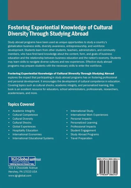 Study abroad programs have been used as unique opportunities to study a country's globalization business skills, diversity awareness, entrepreneurship, and workforce development. Students learn from other students, teachers, administrators, and community members, who have first-hand knowledge about the content, form, and goals of business education and the relationship between business education and the nation's economy. Students may learn skills to navigate diverse cultures and new experiences. Effective study abroad programs may prepare students with the necessary skills to enter the workforce. Fostering Experiential Knowledge of Cultural Diversity Through Studying Abroad explores the impact that participating in study abroad programs has on fostering professional and personal development. It encourages the development of cultural competence in education. Covering topics such as cultural shocks, academic integrity, and personalized learning, this book is an excellent resource for educators, school administrators, professionals, researchers, academicians, and more.