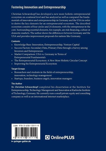 Christian Schwarzkopf has developed a new more holistic entrepreneurial ecosystem on a national level and has analyzed as well as compared the fundamentals of innovation and entrepreneurship in Germany and the USA in order to derive the key elements for an entrepreneurial ecosystem. The described ecosystem consists of four circles and 24 elements, with the entrepreneur in the core. Surrounding essential elements, for example, are risk financing, culture or domestic markets. The author shows the differences between Germany and the USA and provides improvement proposals for nations like Germany.
