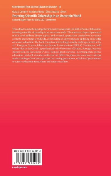 Chapter1. Unpredictability and Uncertainty ... How can science education inspire young people to act for citizenship.- Chapter2. Learning and becoming in movement - a conceptual lens to research in science education, committed to fostering scientific citizenship in an uncertain world.- Chapter3. Looking toward the future: learning from investigations with newly hired science teachers.- Chapter4. Teaching nature of science through stories based on the history of the balance of nature idea: insights from the first cycle of a developmental study.- Chapter5. A Content Analysis of the Representation of The Nature of Science in A Turkish Science Textbook.- Chapter6. Structure and measurement of system competence - promoting systems thinking using analogue and digital models.- Chapter7. Identifying performance levels of enacted pedagogical content knowledge in pre-service biology teachers' lesson plans.- Chapter8. Oh, no - that's Disgusting! Influence of disgust and different teaching methods on students' State of Interest.- Chapter9. How suitable are explanation videos for the chemistry classroom? - analysing and evaluating an explanation video on metal bonding.- Chapter10. Context-based learning as a method for differentiated instruction in chemistry education.- Chapter11. Using fiction in physics' laboratories to engage undergrad students.- Chapter12. Inquiry and argumentation practices enacted by early students in an inquiry cycle about gravity and air friction.- Chapter13. An approach to generating guidelines for designing scientific argumentation competence assessments.- Chapter14. Teachers' use of explicit instruction when planning lessons to foster students' scientific inquiry competencies.- Chapter15. Irish primary teachers' perspectives on the challenges and positives of teaching science during the covid-19 crisis.- Chapter16. Virus-related knowledge in pandemic times - results from two cross-sectional studies in austria and implications for secondary education.- Chapter17. Inoculating adolescents against climate change misinformation.- Chapter 18. Two-eyed seeing and scientific holism in a new science environment health pedagogy.- Chapter 19. Coming together across differences: the uniting role of social justice in science education.