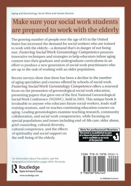 The growing number of people over the age of 65 in the United States has increased the demand for social workers who are trained to work with the elderly - a demand that's in danger of not being met. Fostering Social Work Gerontology Competence presents innovative techniques and strategies to help educators infuse aging content into their graduate and undergraduate curriculums in an effort to produce a new generation of social work practitioners who are up to the task of working with an older population.