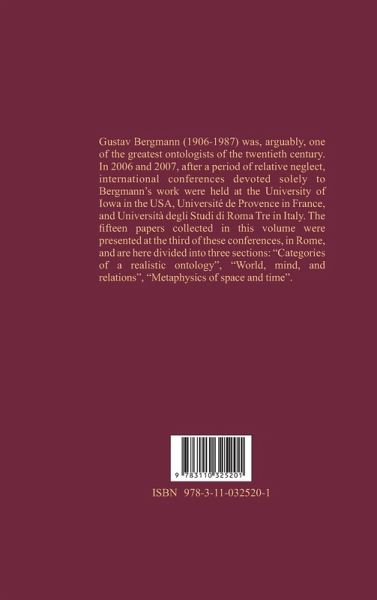 Gustav Bergmann (1906-1987) was, arguably, one of the greatest ontologists of the twentieth century. In 2006 and 2007, after a period of relative neglect, international conferences devoted solely to Bergmann's work were held at the University of Iowa in the USA, Université de Provence in France, and Università degli Studi di Roma Tre in Italy. The fifteen papers collected in this volume were presented at the third of these conferences, in Rome, and are here divided into three sections: "Categories of a realistic ontology", "World, mind, and relations", "Metaphysics of space and time".