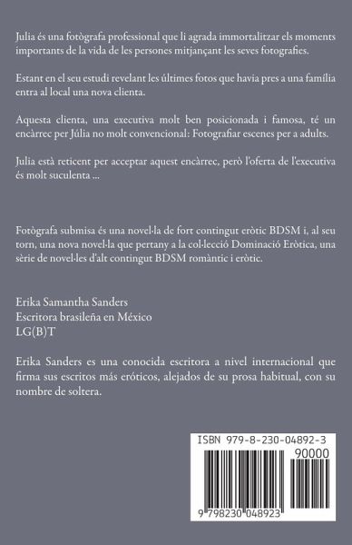 Julia és una fotògrafa professional que li agrada immortalitzar els moments importants de la vida de les persones mitjançant les seves fotografies. Estant en el seu estudi revelant les últimes fotos que havia pres a una família entra al local una nova clienta. Aquesta clienta, una executiva molt ben posicionada i famosa, té un encàrrec per Júlia no molt convencional: Fotografiar escenes per a adults. Julia està reticent per acceptar aquest encàrrec, però l'oferta de l'executiva és molt suculenta ... Fotògrafa submisa és una novel-la de fort contingut eròtic BDSM i, al seu torn, una nova novel-la que pertany a la col-lecció Dominació Eròtica, una sèrie de novel-les d'alt contingut BDSM romàntic i eròtic.