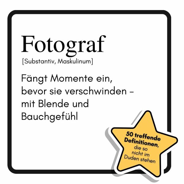 Achtung, hier wird nicht geknipst, hier wird Geschichte geschrieben! "Fotograf: Fängt Momente ein, bevor sie verschwinden - mit Blende und Bauchgefühl" liefert 50 humorvolle Definitionen, die zeigen, warum Fotografen mehr als nur Technik-Nerds mit teuren Kameras sind. Jede Seite bringt ein Schmunzeln und ein Aha-Erlebnis - von der Speicherkarte bis zum Workshop, von der goldenen Stunde bis zum Passanten, der immer ins Bild läuft.Für wen dieses Buch optimal geeignet ist:- Für alle, die Fotografie lieben, aber auch über sich selbst lachen können- Für Hobby- und Profifotografen mit Sinn für Selbstironie- Für alle, die ein originelles Geschenk für Fotofans suchenEin kreativer Streifzug durch die Welt der Fotografie, der Technik und Bauchgefühl mit einer Prise Humor verbindet. Perfekt für das Bücherregal, den Couchtisch oder die Kameratasche.Was beim Kauf dieses Buches erwartet werden kann:- 50 witzige Definitionen rund um Fotografie- Passende Illustrationen zu jedem Begriff- Ein Geschenk, das garantiert für Lacher sorgt- Fotografie-Wissen mit Augenzwinkern