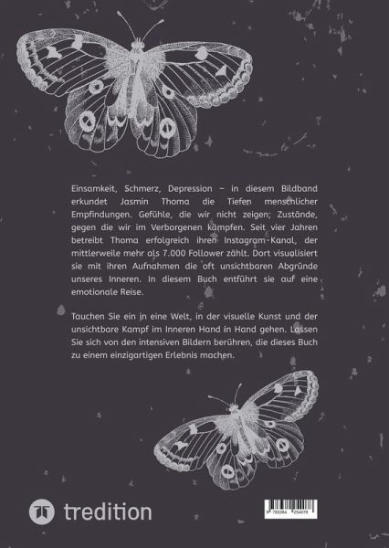 Einsamkeit, Schmerz, Depression - in diesem Bildband erkundet Jasmin Thoma die Tiefen menschlicher Empfindungen. Gefühle, die wir nicht zeigen; Zustände, gegen die wir im Verborgenen kämpfen. Seit vier Jahren betreibt Thoma erfolgreich ihren Instagram-Kanal, der mittlerweile mehr als 7.000 Follower zählt. Dort visualisiert sie mit ihren Aufnahmen die oft unsichtbaren Abgründe unseres Inneren. In diesem Buch entführt sie auf eine emotionale Reise.Tauchen Sie ein in eine Welt, in der visuelle Kunst und der unsichtbare Kampf im Inneren Hand in Hand gehen. Lassen Sie sich von den intensiven Bildern berühren, die dieses Buch zu einem einzigartigen Erlebnis machen.