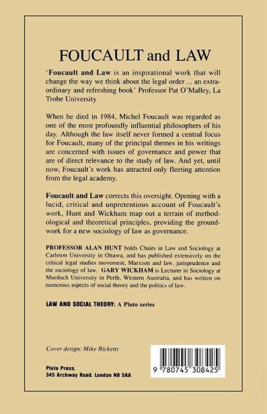 'An inspirational work that will change the way we think about the legal order.' Professor Pat O'Malley, La Trobe University 'This lively and lucid book will do much to show the importance of viewing law as an aspect of governmentality.' Professor David Garland, University of Edinburgh When he died in 1984, Michel Foucault was regarded as one of the most profoundly influential philosophers of his day. Although the law itself never formed a central focus for Foucault, many of the principal themes in his writings are concerned with issues of governance and power that are of direct relevance to the study of law. And yet, until now, Foucault's work has attracted only fleeting attention from the legal academy. Foucault and Law corrects this oversight. Opening with a lucid, critical and unpretentious account of Foucault's work, Hunt and Wickham map out a terrain of methodological and theoretical principals, providing the groundwork for a new sociology of law as governance.
