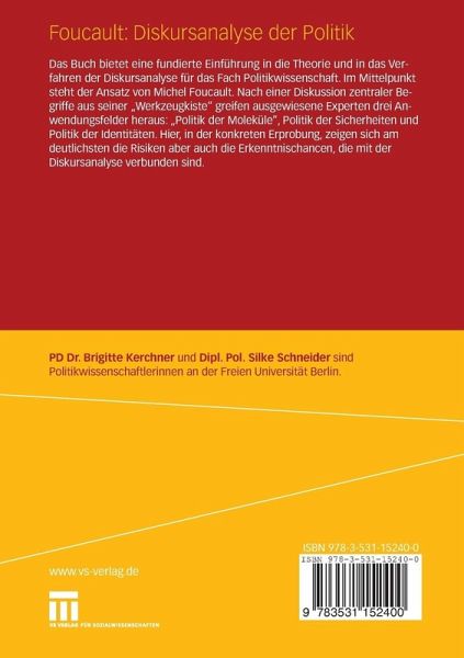 Das Buch bietet eine fundierte Einführung in die Theorie und in das Verfahren der Diskursanalyse für das Fach Politikwissenschaft. Im Mittelpunkt steht der Ansatz von Michel Foucault. Nach einer Diskussion zentraler Begriffe aus seiner "Werkzeugkiste" greifen ausgewiesene Experten drei Anwendungsfelder heraus: "Politik der Moleküle", Politik der Geschlechter und Politik der Sicherheiten. Hier, in der konkreten Erprobung, zeigen sich am deutlichsten die Risiken aber auch die Erkenntnischancen, die mit der Diskursanalyse verbunden sind.