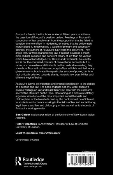 Foucault's Law is an important and original contribution to the ongoing debate on Foucault and law, engaging not only with Foucault's diverse writings on law and legal theory, but also with the extensive interpretive literature on the topic. It will thus be of interest to students and scholars working in the fields of law and social theory, legal theory and law and philosophy, as well as to students of Foucault's work generally.