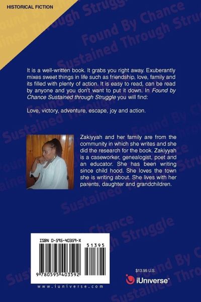 It is a well-written book. It grabs you right away. Exuberantly mixes sweet things in life such as friendship, love, family and its filled with plenty of action. It is easy to read, can be read by anyone and you don't want to put it down. In Found by Chance Sustained through Struggle you will find: Love, victory, adventure, escape, joy and action.