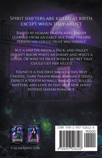 Can I survive in a world that hates what I am? Raised by human traffickers, I learned from an early age that the one person I can trust is myself. But I'm rescued and brought to Thornbriar Academy and I know I've only traded one kind of imprisonment for another. When a found-family pack of hot shifters takes me in, I start to believe I've found a home. Until I discover a devastating secret that just might get me—and them—killed. Will I find a place where I'm safe and loved? Found is a reverse harem novel featuring one tough-as-nails innocent and the sexy elemental shifters who come to love her (including a merman shifter, a panther shifter, a vampire shifter, and a dragon shifter). Expect fated mates, bullies, unusual shifters, vampires, and love in this new adult college-age romance. Approximently 160 pages. READ THE WHOLE SERIES - also available as audiobooks! Thornbriar Academy Prequel short story: Lost Book 1: Found Book 2: Bound Book 3: Saved One-click to jump into this steamy Thornbriar Academy fated mates, why choose paranormal romance story, and exciting series starter to USA Today bestselling author Cali Mann's intriguing world of shifters, vampires, and romance.