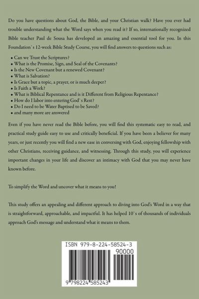 Do you have questions about God, the Bible, and your Christian walk? Have you ever had trouble understanding what the Word says when you read it? If so, internationally recognized Bible teacher Paul de Sousa has developed an amazing and essential tool for you. In this Foundation`s 12-week Bible Study Course, you will find answers to questions such as: Can we Trust the Scriptures? What is the Promise, Sign, and Seal of the Covenants? Is the New Covenant but a renewed Covenant? What is Salvation? Is Grace but a topic, a prayer, or is much deeper? Is Faith a Work? What is Biblical Repentance and is it Different from Religious Repentance? How do I labor into entering God`s Rest? Do I need to be Water Baptised to be Saved? and many more are answered Even if you have never read the Bible before, you will find this systematic easy to read, and practical study guide easy to use and critically beneficial. If you have been a believer for many years, or just recently you will find a new ease in conversing with God, enjoying fellowship with other Christians, receiving guidance, and witnessing. Through this study, you will experience important changes in your life and discover an intimacy with God that you may never have known before. To simplify the Word and uncover what it means to you! This study offers an appealing and different approach to diving into God's Word in a way that is straightforward, approachable, and impactful. It has helped 10`s of thousands of individuals approach God's message and understand what it means to them.