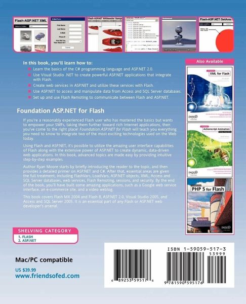 This book covers Flash MX 2004 and Flash 8, ASP.NET 2.0, Visual Studio 2005, and Access and SQL Server 2005. It is an essential part of any Flash or ASP.NET web developer's arsenal.