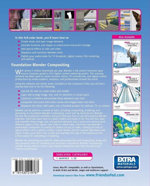 Digital Compositing with Blender.- Part 1 Introduction. Blender Overview. Production Workflow. Blender in the Pipeline. Formats.- Part 2 Elements in 3D. 3D Space. Cameras and Perspectives. Materials and Textures. Masks & Rotoscoping. Lighting and Rendering.- Part 4 Node-based Compositor. Inputs and Outputs. Color Correction & Channel Adjustment. Blurs & Distortion. Green Screen and Alpha. Re-Lighting and Re-Texturing.- Part 5 Editing and Audio. VSE Splicing and Operation. VSE Effects. Audio Integration.- Appendix. BBB. Commercials. Video Tutorial.