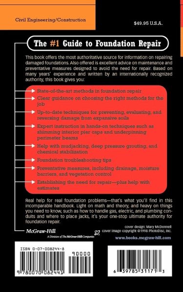 The #1 guide to foundation repair This book offers the most authoritative source of information on repairing damaged foundations, with excellent advice on maintenance and preventative measures designed to avoid the need for repair. You get state-of-the-art methods in foundation repair;clear guidance on choosing the right methods for the job; up-to-date techniques for preventing, evaluating, and reversing damage from expansive soils; expert instruction in hands-on techniques such as shimming interior pier caps and underpinning perimeter beams; help with mudjacking, deep pressure grouting, and chemical stabilization; foundation troubleshooting tips; preventative measures, including drainage, moisture barriers, and vegetation control; establishing the need for repair - plus help with estimates.