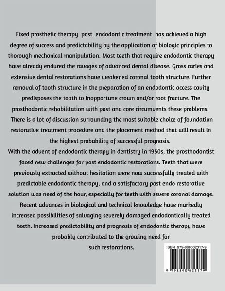 A meaningful insight into the world of foundation restorations in fixed prosthodontics. The book is a must read for dental students and professionals. All aspects have been highlighted from historic significance to recent advancements. Proper foundation of endodontically treated teeth begins with a good understanding of their physical and biomechanical properties, anatomy, and a sound knowledge of the endodontic, periodontal, restorative and occlusal principles. The choice of core material and the final restoration are important in achieving long-term clinical success. The book provides an exhaustive review on post and cores.