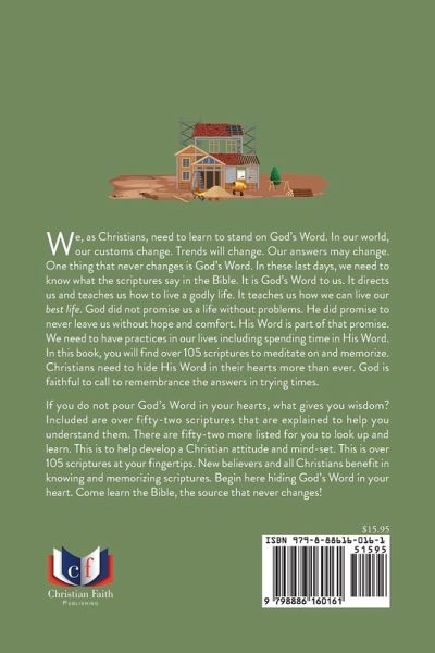 We, as Christians, need to learn to stand on God's Word. In our world, our customs change. Trends will change. Our answers may change. One thing that never changes is God's Word. In these last days, we need to know what the scriptures say in the Bible. It is God's Word to us. It directs us and teaches us how to live a godly life. It teaches us how we can live our best life. God did not promise us a life without problems. He did promise to never leave us without hope and comfort. His Word is part of that promise. We need to have practices in our lives including spending time in His Word. In this book, you will find over 105 scriptures to meditate on and memorize. Christians need to hide His Word in their hearts more than ever. God is faithful to call to remembrance the answers in trying times. If you do not pour God's Word in your hearts, what gives you wisdom? Included are over fifty-two scriptures that are explained to help you understand them. There are fifty-two more listed for you to look up and learn. This is to help develop a Christian attitude and mind-set. This is over 105 scriptures at your fingertips. New believers and all Christians benefit in knowing and memorizing scriptures. Begin here hiding God's Word in your heart. Come learn the Bible, the source that never changes!