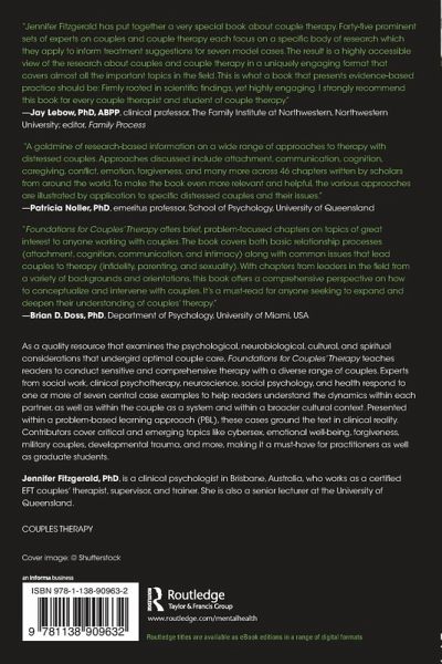 As a quality resource that examines the psychological, neurobiological, cultural, and spiritual considerations that undergird optimal couple care, Foundations for Couplesâ Therapy teaches readers to conduct sensitive and comprehensive therapy with a diverse range of couples.