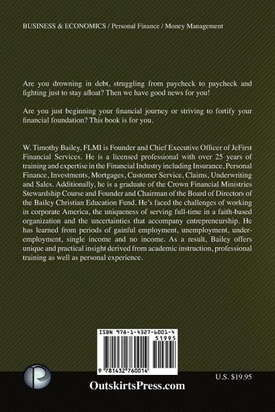 Do you know how to test your financial fitness? If you're like most individuals, facing your financial fitness is a frightening thought. You're living from paycheck to paycheck, drowning in debt and fighting just to stay afloat. And it's no surprise. Formal education taught you how to get a job and make money. But whether you earned a Ph.D., a GED or even an SUV! you probably were never taught what to do with money once you got it. Right? This book is presented to help you understand the fundamentals of handling money and assist you in building a firm foundation for financial fitness. We'll walk beside you and help you steer clear of many of the pitfalls that have severely wounded so many. Throughout life's journey, each of us - whether poor, privileged or anywhere in between - will face financial storms. You can survive and even thrive through these tough times if you possess a firm financial foundation. When the winds howl and the waves beat against your financial ship, your anchor must grip a solid rock. Whether you are just beginning your financial journey or striving to fortify your financial foundation, this book is for you. As an added bonus, we've include 95 Ways to Put Money In Your Pocket. W. Timothy Bailey, FLMI is Founder and Chief Executive Officer of JeFirst Financial Services. He is a licensed financial professional with over 25 years of expertise in the financial industry. His professional experience includes expertise in Financial Services, Insurance, Investments and Mortgages. He has earned the prestigious FLMI designation from the Life Office Management Association and successfully completed the Crown Financial Ministries Stewardship Biblical Financial Study Course. Additionally, he is the Founder and Chairman of the Board of Directors of the Bailey Christian Education Fund. Bailey is the architect of the Faithful Financial Stewardship (FFS) Seminar. This 8 session, practical, interactive seminar is designed to provide realistic tools and solutions to promote financial health. Many individuals are in financial distress and have been deceived and led to believe there is no way out. They'd like to be good stewards of their resources but no one has shown them how in language they could understand. FFS provides the solutions. Not only does Mr. Bailey draw from his professional training, he speaks from his personal experience. From the challenges of working in corporate America to the uniqueness of serving full-time in a faith-based organization to the uncertainties that accompany entrepreneurship. He has learned from periods of gainful employment, unemployment, under-employment, single income and no income. "I've been through times with a lot of debt and I've been through times with almost no debt. Through it all, God has given grace to be content in whatever state I've been."