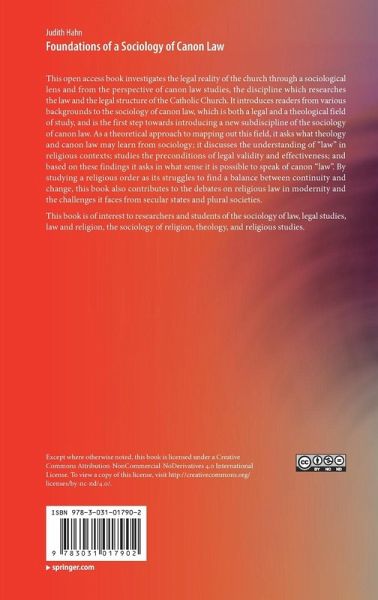 This "Open Access" book investigates the legal reality of the church through a sociological lens and from the perspective of canon law studies, the discipline which researches the law and the legal structure of the Catholic Church. It introduces readers from various backgrounds to the sociology of canon law, which is both a legal and a theological field of study, and is the first step towards introducing a new subdiscipline of the sociology of canon law. As a theoretical approach to mapping out this field, it asks what theology and canon law may learn from sociology; it discusses the understanding of "law" in religious contexts; studies the preconditions of legal validity and effectiveness; and based on these findings it asks in what sense it is possible to speak of canon "law". By studying a religious order as its struggles to find a balance between continuity and change, this book also contributes to the debates on religious law in modernity and the challenges it faces fromsecular states and plural societies.