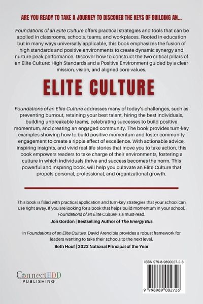 Foundations of an Elite Culture offers practical strategies and tools that can be applied in classrooms, schools, teams, and workplaces. Rooted in education but in many ways universally applicable, this book emphasizes the fusion of high standards and positive environments to create dynamic synergy and nurture peak performance. Discover how to construct the two critical pillars of an Elite Culture: High Standards and a Positive Environment guided by a clear mission, vision, and aligned core values. Foundations of an Elite Culture addresses many of today's challenges, such as preventing burnout, retaining your best talent, hiring the best individuals, building unbreakable teams, celebrating successes to build positive momentum, and creating an engaged community. The book provides turn-key examples showing how to build positive momentum and foster community engagement to create a ripple effect of excellence. With actionable advice, inspiring insights, and vivid real-life stories that move you to take action, this book empowers readers to take charge of their environments, fostering a culture in which individuals thrive and success becomes the norm. This powerful and inspiring book, will help you cultivate an Elite Culture that propels personal, professional, and organizational growth.