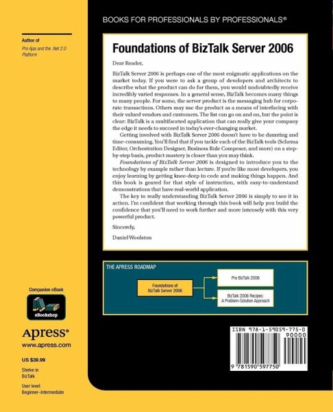 Since Microsofts release of BizTalk Server 2006, there is a serious need for more documentation on this product. Foundations of BizTalk Server 2006 fills that void. The book will take you from novice to professional, equipping you with the tools you'll need to get started in the world of BizTalk server integration.