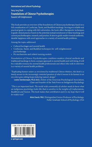 This book provides an overview of the foundations of Chinese psychotherapy, based on a full consideration of Confucian, Taoist, and Buddhist teachings. Serving as a reliable and practical guide to coping with life's adversities, the book offers therapeutic techniques to guide clinical practice based on the potential mutual enrichment of these teachings and current psychotherapies, research, and practice. It aims to guide readers towards authentic, durable happiness with novel approaches to a variety of mental health problems.