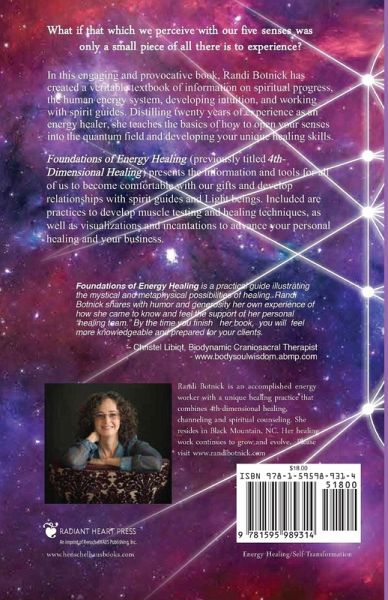 What if that which we perceive with our five senses was only a small piece of all there is to experience? In this engaging and provocative book, Randi Botnick has created a veritable textbook of information on spiritual progress, the human energy system, developing intuition, and working with spirit guides. Distilling twenty years of experience as an energy healer, she teaches the basics of how to open your senses into the quantum field and developing your unique healing skills. Foundations of Energy Healing (previously titled 4th-Dimensional Healing ) presents the information and tools for all of us to become comfortable with our gifts and develop relationships with spirit guides and Light beings. Included are practices to develop muscle testing and healing techniques, as well as visualizations and incantations to advance your personal healing and your business.