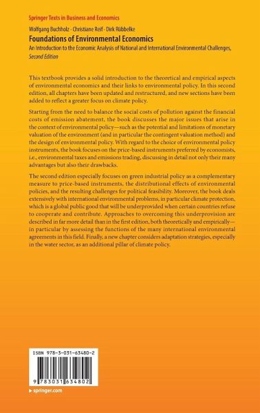 This textbook provides a solid introduction to the theoretical and empirical aspects of environmental economics and their links to environmental policy. In this second edition, all chapters have been updated and restructured, and new sections have been added to reflect a greater focus on climate policy.