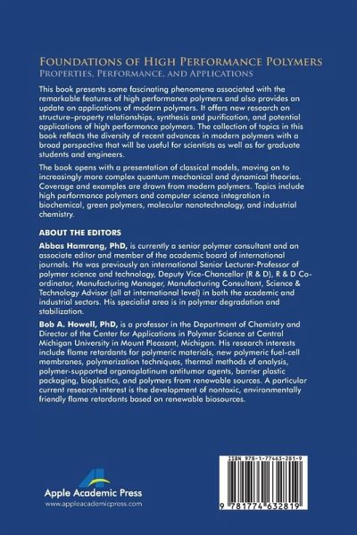 This book presents some fascinating phenomena associated with the remarkable features of high performance polymers and also provides an update on applications of modern polymers. It offers new research on structure-property relationships, synthesis and purification, and potential applications of high performance polymers. The collection of topics in this book reflects the diversity of recent advances in modern polymers with a broad perspective that will be useful for scientists as well as for graduate students and engineers. The book opens with a presentation of classical models, moving on to increasingly more complex quantum mechanical and dynamical theories. Coverage and examples are drawn from modern polymers. Topics include high performance polymers and computer science integration in biochemical, green polymers, molecular nanotechnology, and industrial chemistry.