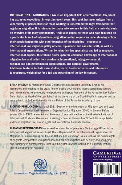 International migration law is an important field of international law, which has attracted exceptional interest in recent years. This book has been written from a wide variety of perspectives for those wanting to understand the legal framework that regulates migration. It is intended for students new to this field of study who seek an overview of its many components. It will also appeal to those who have focussed on a particular branch of international migration law but require an understanding of how their specialisation fits with other branches of the discipline. Written by migration law specialists and led by respected international experts, this volume draws upon the combined knowledge of international migration law and policy from academia; international, intergovernmental, regional and non-governmental organisations; and national governments. Additional features include case studies, maps, break-out boxes and references to resources which allow for a full understanding of the law in context.