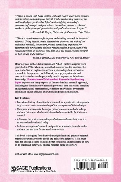 Drawing from authors John Brewer and Albert Hunter's original work published in 1989, when single method research was the standard, this new text offers an explanation of how a planned synthesis of various research techniques such as fieldwork, surveys, experiments, and nonreactive studies can be purposely used to improve social science knowledge. Foundations of Multimethod Research: Synthesizing Styles explores the many aspects of the multimethod research approach, including the formulation of research problems, data collection, sampling and generalization, measurement, reliability and validity, hyposthesis testing and causal analysis, and writing and publicizing results.