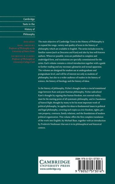 In the history of philosophy, Fichte's thought marks a crucial transitional stage between Kant and post-Kantian philosophy. Fichte radicalized Kant's thought by arguing that human freedom, not external reality, must be the starting point of all systematic philosophy, and in Foundations of Natural Right, thought by many to be his most important work of political philosophy, he applies his ideas to fundamental issues in political and legal philosophy, covering such topics as civic freedom, rights, private property, contracts, family relations, and the foundations of modern political organization. This volume offers a complete translation of the work into English, by Michael Baur, together with an introduction by Frederick Neuhouser that sets it in its philosophical and historical context.