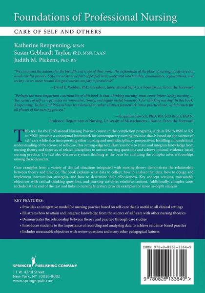 Integrates the science of self-care with other nursing and multidisciplinary perspectives This is the first text for the Professional Nursing Practice course in RN to BSN curriculum to present a conceptual framework for contemporary nursingpractice based on the science of self-care that also incorporates other nursing and multidisciplinary perspectives. Built upon the premise that nursing isboth a caring and a knowledge-based profession, this cutting-edge text illustrates how to attain and integrate knowledge from nursing theory and theoriesof related disciplines to achieve optimal evidence-based nursing practice. Using case studies to demonstrate the relationship between nursing theory andpractice, the text underscores the importance of having a deep understanding and conceptual model of the unique role of nursing in society and its practicedomain. The text instills a foundational understanding of the science of self-care and its contribution to contemporary nursing. It describes how this paradigm isgaining recognition as an effective anti-burnout strategy and demonstrates how it can be applied. Case examples from a variety of clinical situationsintegrated with nursing theory demonstrate the variables needed to achieve optimal nursing practice. The book illustrates what data to collect, how toanalyze that data, how to design and implement intervention strategies, and how to determine their effectiveness. Key concept boxes, measurable objectiveswith critical thinking questions, and learning activities reinforce content. Additionally, more complex cases included at the end of the text and frequentlinks to nursing literature provide fodder for more in-depth analysis. Key Features: Provides an integrative model for nursing practice based on self-care that is useful in all clinical settings Illustrates how to attain and integrate knowledge from the science of self-care with other nursing theories Demonstrates the relationship between theory and practice through case studies Introduces students to the importance of recording and analyzing data to achieve evidence-based practice Includes measurable objectives with review questions at the end of chapters and many other pedagogical features