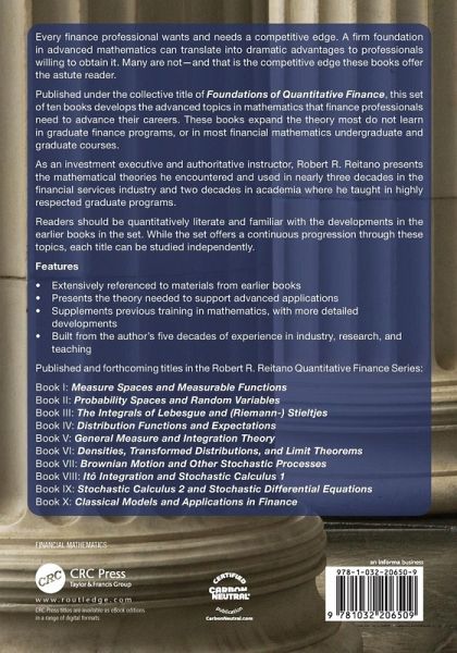 Published under the collective title of Foundations of Quantitative Finance, this set of ten books develops the advanced topics in mathematics that finance professionals need to advance their careers. These books expand the theory most do not learn in graduate finance programs, or in most financial mathematics undergraduate and graduate courses.