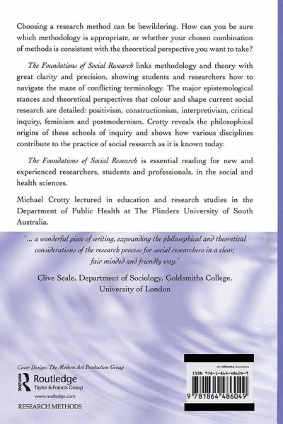 Choosing a research method can be bewildering. How can you be sure which methodology is appropriate, or whether your chosen combination of methods is consistent with the theoretical perspective you want to take? The Foundations of Social Research links methodology and theory with great clarity and precision, showing students and researchers how to navigate the maze of conflicting terminology. The major epistemological stances and theoretical perspectives that colour and shape current social research are detailed: positivism, constructionism, interpretivism, critical inquiry, feminism and postmodernism. Crotty reveals the philosophical origins of these schools of inquiry and shows how various disciplines contribute to the practice of social research as it is known today. The Foundations of Social Research is essential reading for new and experienced researchers, students and professionals, in the social and health sciences. ' .a wonderful piece of writing, expounding the philosophical and theoretical considerations of the research process for social researchers in a clear, fair minded and friendly way.' Clive Seale, Department of Sociology, Goldsmiths College, University of London