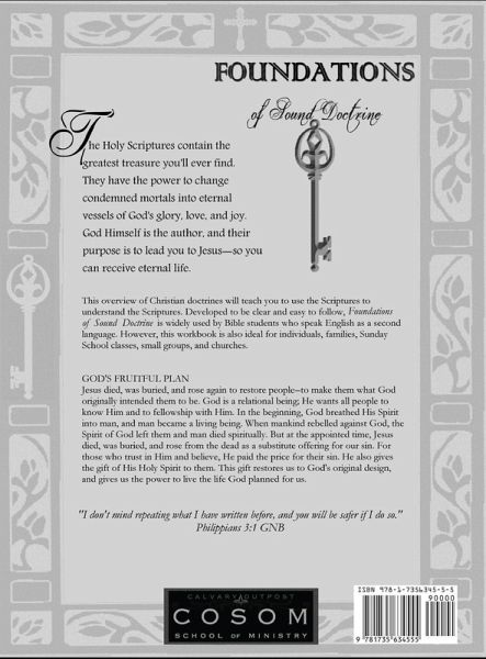 The Holy Scriptures contain the greatest treasure you'll ever find. They have the power to change condemned mortals into eternal vessels of God's glory, love, and joy. God Himself is the author, and their purpose is to lead you to Jesus-so you can receive eternal life. This overview of Christian doctrines will teach you to use the Scriptures to understand the Scriptures. Developed to be clear and easy to follow, Foundations of Sound Doctrine is widely used by Bible students who speak English as a second language. However, this workbook is also ideal for individuals, families, Sunday school classes, small groups, and churches. GOD'S FRUITFUL PLAN: Jesus died, was buried, and rose again to restore people--to make them what God originally intended them to be. God is a relational being; He wants all people to know Him and fellowship with Him. In the beginning, God breathed His Spirit into man, and man became a living being. When mankind rebelled against God, the Spirit of God left them and man died spiritually. But at the appointed time, Jesus died, was buried, and rose from the dead as a substitute offering for our sin. For those who trust in Him and believe, He paid the price for their sin. He also gives the gift of His Holy Spirit to them. This gift restores us to God's original design, and gives us the power to live the life God planned for us.