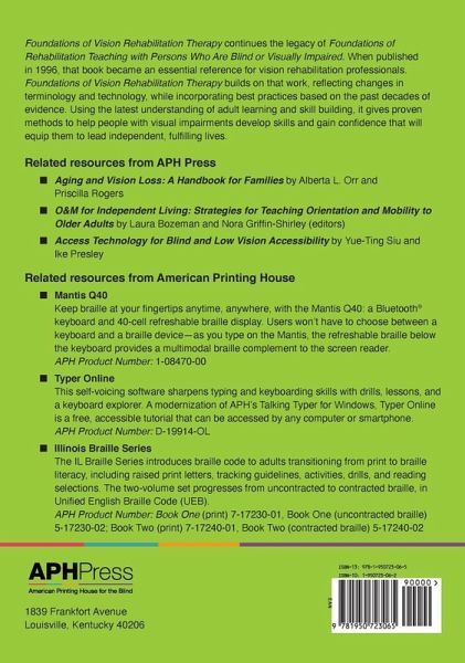 Foundations of Vision Rehabilitation Therapy continues the legacy of Paul Ponchillia and Sue Ponchillia's seminal work Foundations of Rehabilitation Teaching with Persons Who Are Blind or Visually Impaired. After it was published in 1996, that book quickly established itself as an essential reference for vision rehabilitation professionals. Foundations of Vision Rehabilitation Therapy by Helen Lee and Jennifer Ottowitz builds on that important work, reflecting changes in the field over the past two decades. One major development is a change in terminology. In 2004, The Academy or Certification for Vision Rehabilitation and Education Professionals (ACVREP), the certifying body for rehabilitation teachers, changed the professional designation from rehabilitation teacher to vision rehabilitation therapist. This new edition also benefits from the significant increase in technology resources as well as advances in research since 1996. Foundations of Vision Rehabilitation Therapy reflects the contemporary understanding of adult learning and skill building, providing proven techniques to help people with visual impairments develop skills and gain confidence that will equip them to lead independent, fulfilling lives.